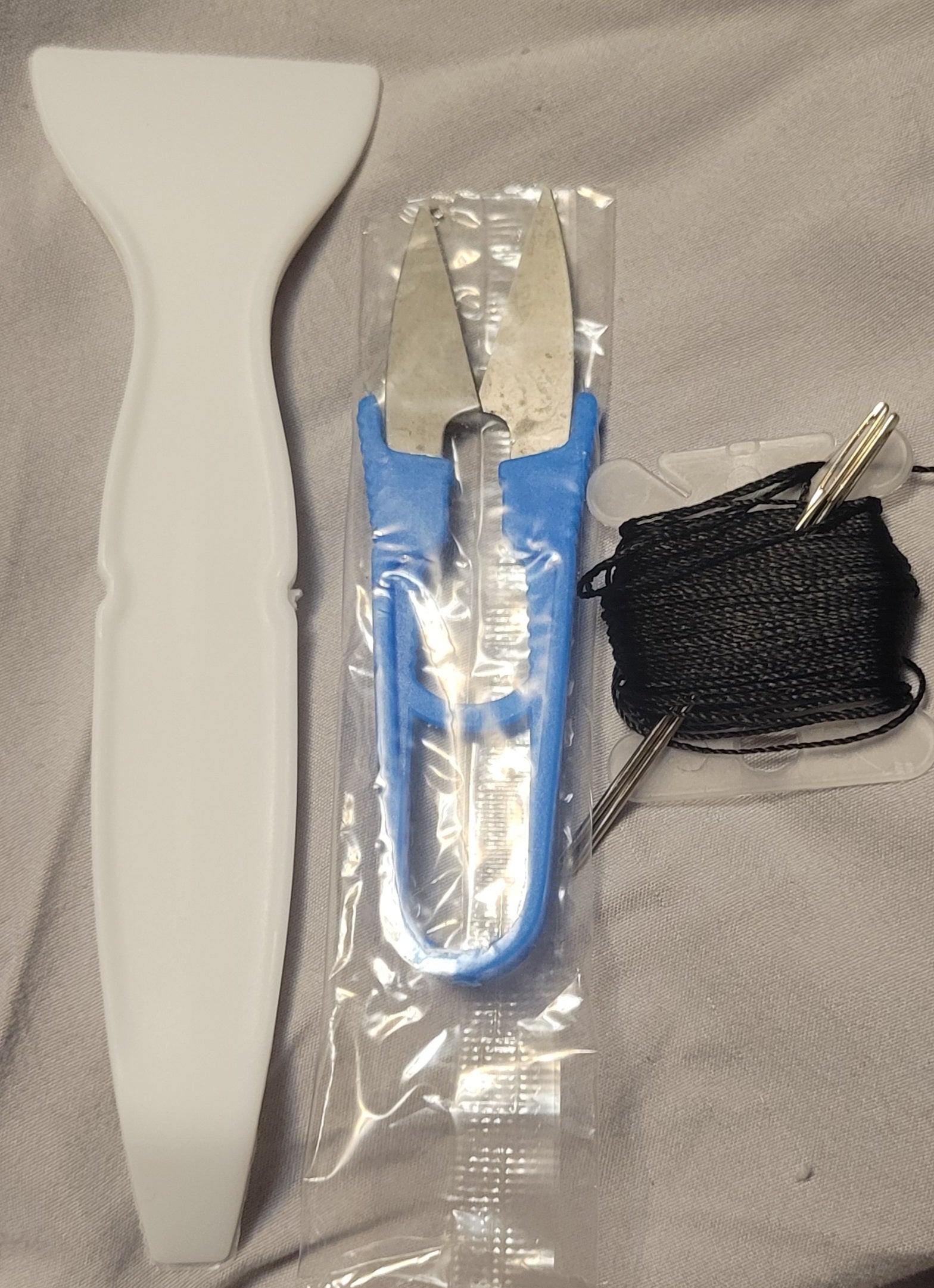 - DIY Steering Wheel Cover Kit Includes: Leather steering wheel cover, thread and needles for stitching, double sided tape, Scissors, and tool to hold in place.